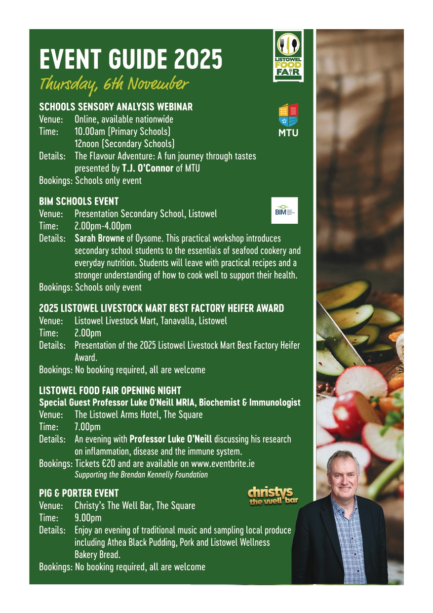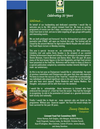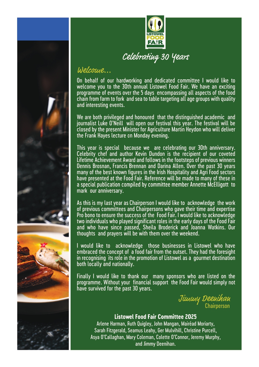 On behalf of our hardworking and dedicated committee I would like to welcome you to the 30th annual Listowel Food Fair. We have an exciting programme of events over the 5 days encompassing all aspects of the food chain from farm to fork and sea to table targeting all age groups with quality and interesting events.