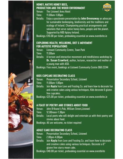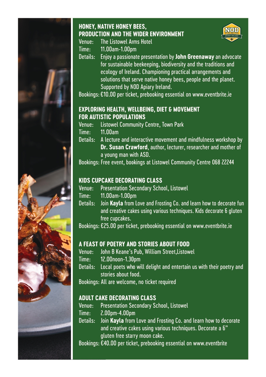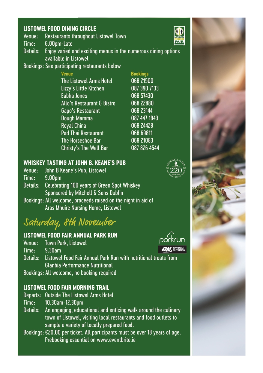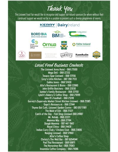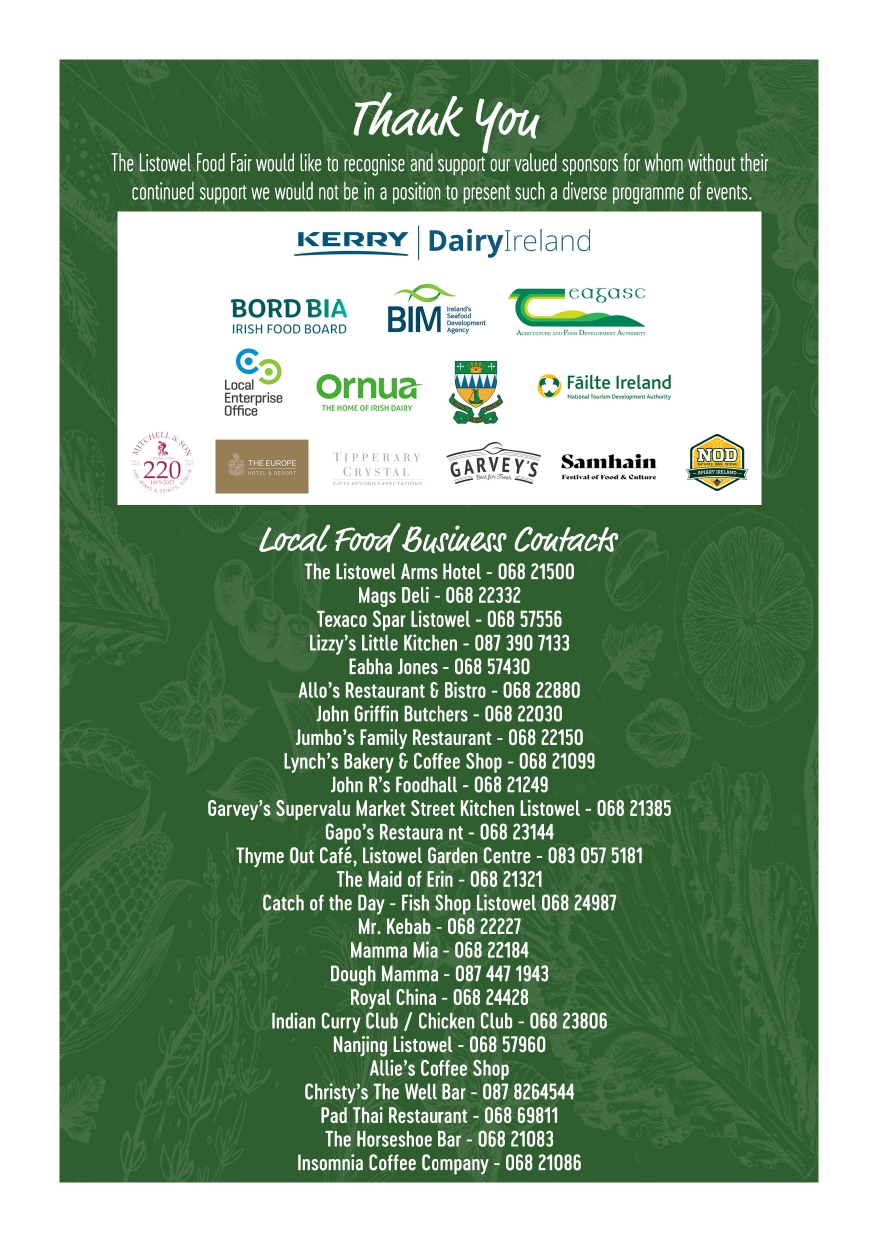 I would like to acknowledge those businesses in Listowel who have embraced the concept of a food fair from the outset. They had the foresight in recognising its role in the promotion of Listowel as a gourmet destination both locally and nationally.